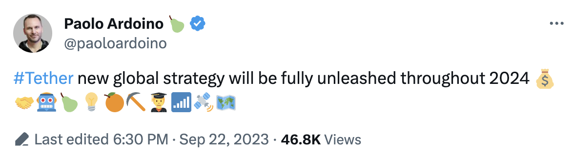 9 月 22 日,Tether 首席技术官 Paolo Ardoino 在其社交平台表示 ,Tether 新全球战略将于 2024 年全面实施。根据其暗示,新全球战略或将包括投融资合作、AI、新能源比特币挖矿、教育、全球范围业务扩张等;10 月,这位首席技术官又宣布,「Tether 现实世界生态(Real World Ecosystem,简称 RWE)即将推出。」