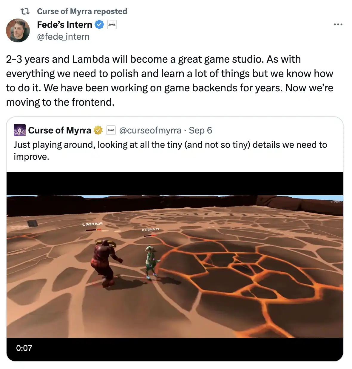 而除了为 zk 领头羊 Starknet 完成开发工作,LambdaClass 也在游戏领域展开了攻势。LambdaClass 目前正在开发一款开源的多人战斗游戏,LambdaClass CEO Federico 甚至表示「 2-3 年后, Lambda 将成为一家出色的游戏工作室。」