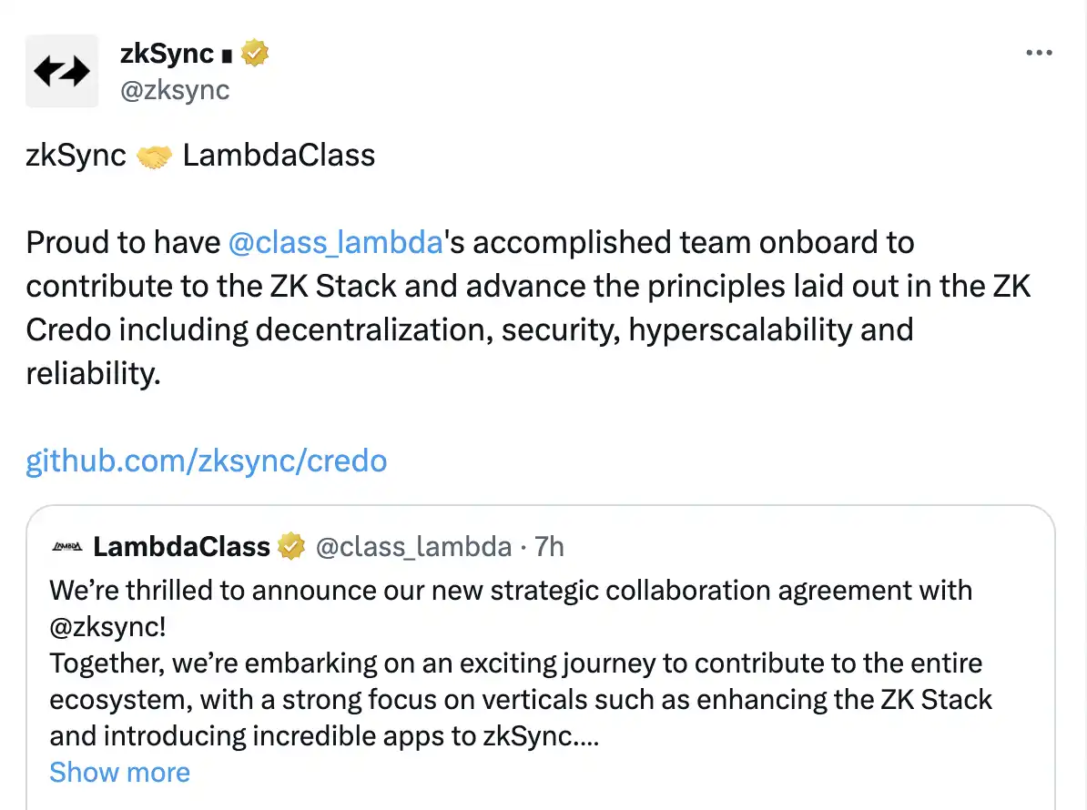 10 月 24 日,此前帮助 Starknet 完成 V1 2 以及 cairoVM 开发的 LambdaClass 团队宣布与 zkSync 达成新的战略合作协议,重点将关注生态的垂直领域,例如增强 ZK Stack 并向 zkSync 引入应用程序。LambdaClass 还表示过去几天内一些顶尖工程师已经加入了 zkSync 团队。