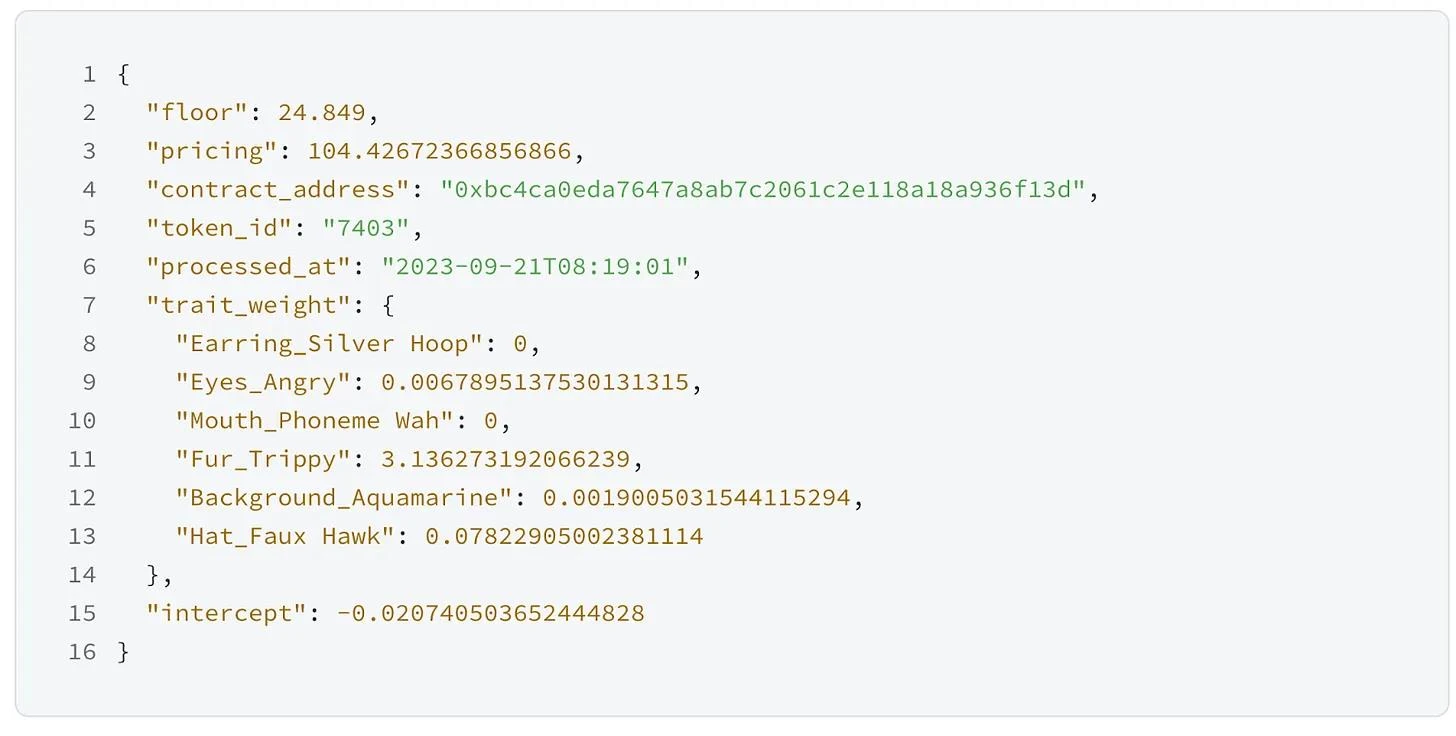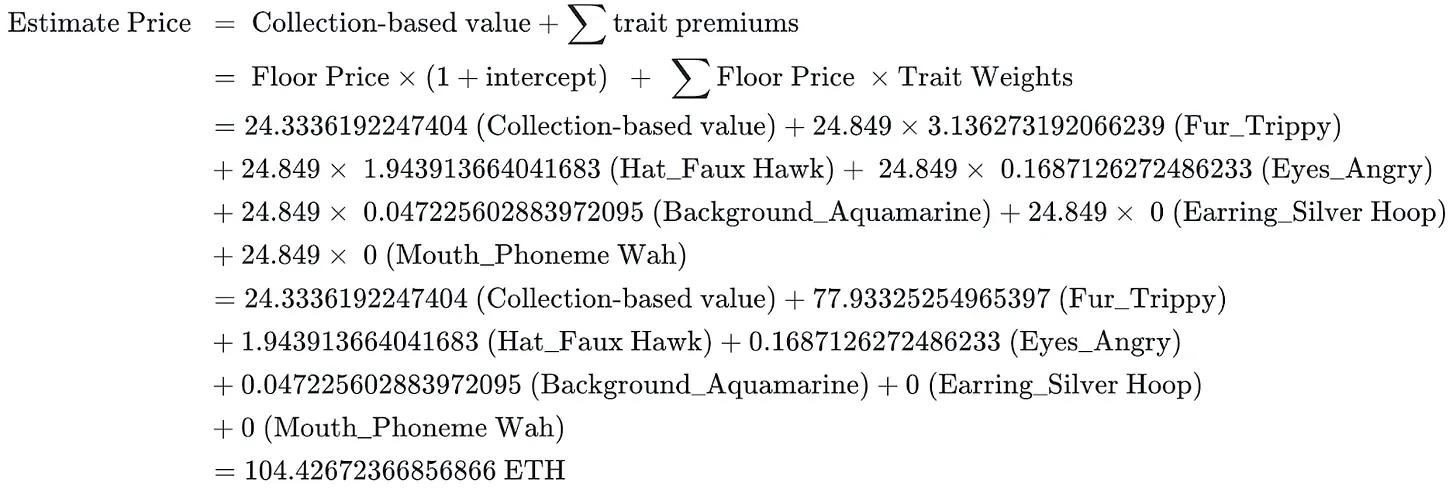 "pricing"是 token 7403 的估计价格,即 104.42672366856866 ETH,"floor"是请求时的地板价。我们的估计价格可以分解为: