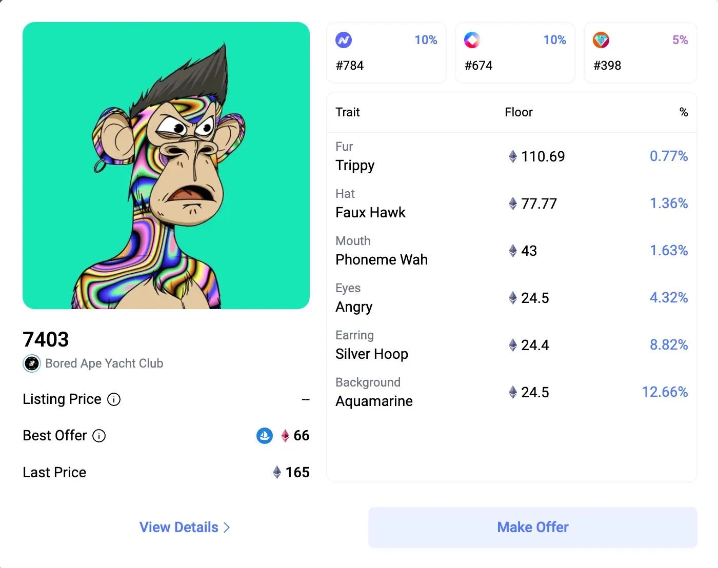 我们可以使用我们的高级定价模型为稀有的 Bored Ape Yacht Club #7403 定价。以下是与此代币相对应的基本信息: