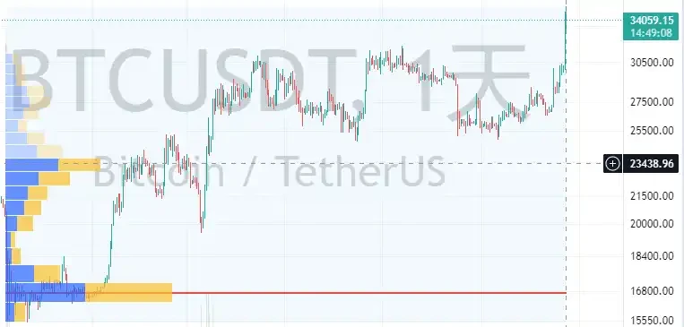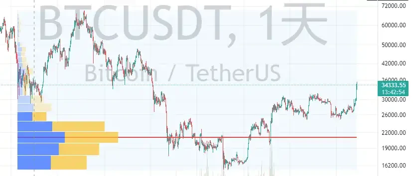 以下图为例,我们选取了自 2022 年 11 月 9 日至今的价格变化区间来观察成交量分布,即 FTX 崩溃时造成的底部至今日价格突破 35, 000 美元价格的最高点。