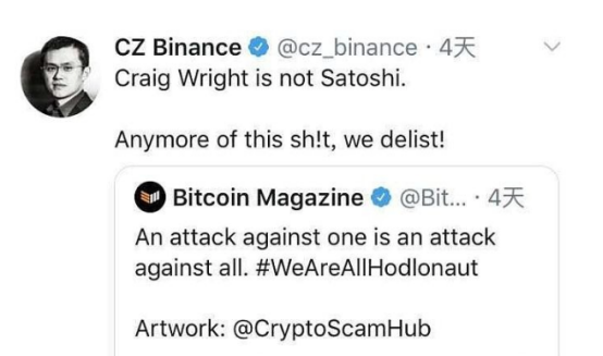 当时币安上线不过两年,对加密圈的大佬而言仅仅是初出茅庐的新人,影响力相当有限。或许也正因此,新人的血气方刚被充分体现,CZ在推特上强势表示,在签名之前,所有人都是中本聪,唯独CSW不是,这是一种欺诈,甚至公开对BSV作出了下架威胁。