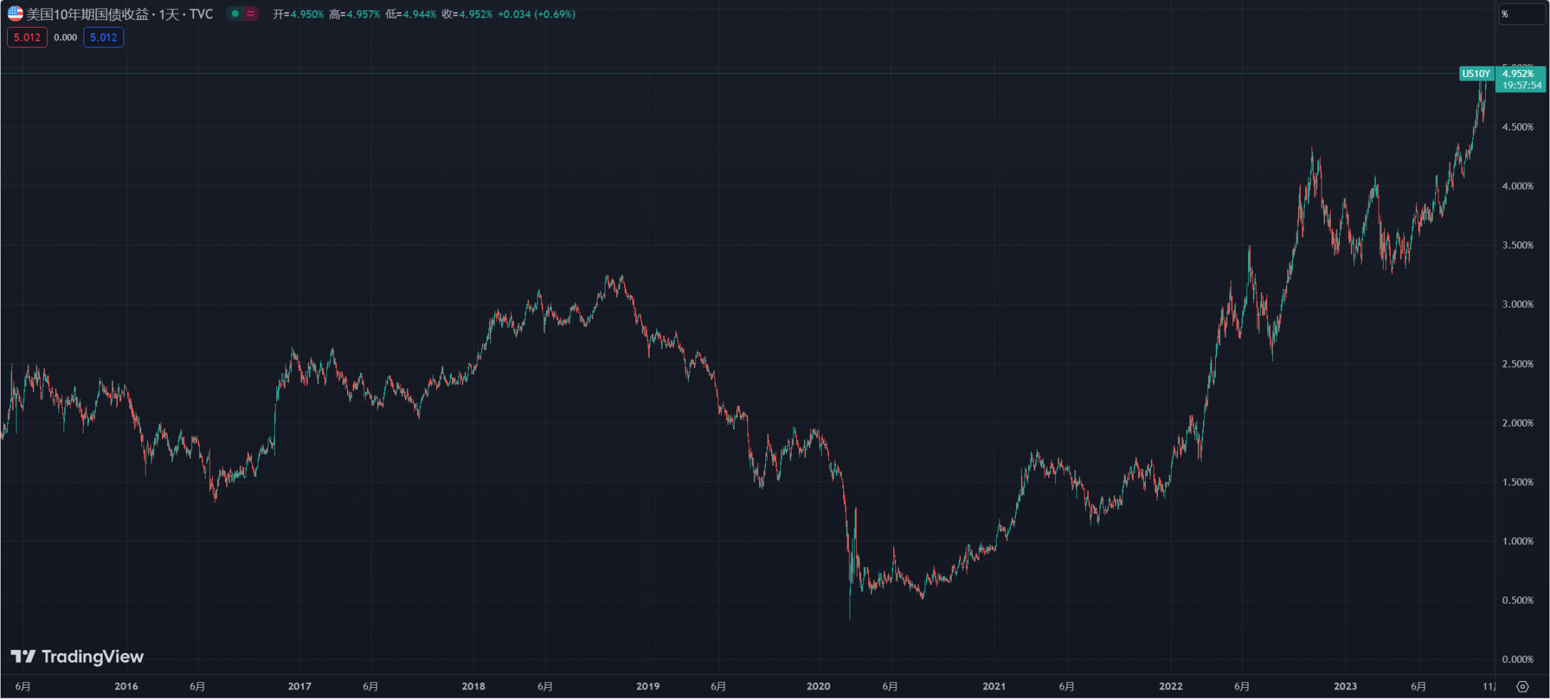 时移事易,被称为「全球资产定价之锚」的 10 年期美债收益率却在过去两个季度节节攀升,昨夜更是一度升破 5% 的整数关口,创下 2007 年 7 月以来的 16 年新高,不过随着「疫情战神」 Bill Ackman、「老债王」比尔·格罗斯等美债大空头们突然集体倒戈,美债收益率盘中迅速下行,收盘跌回 5% 以下。