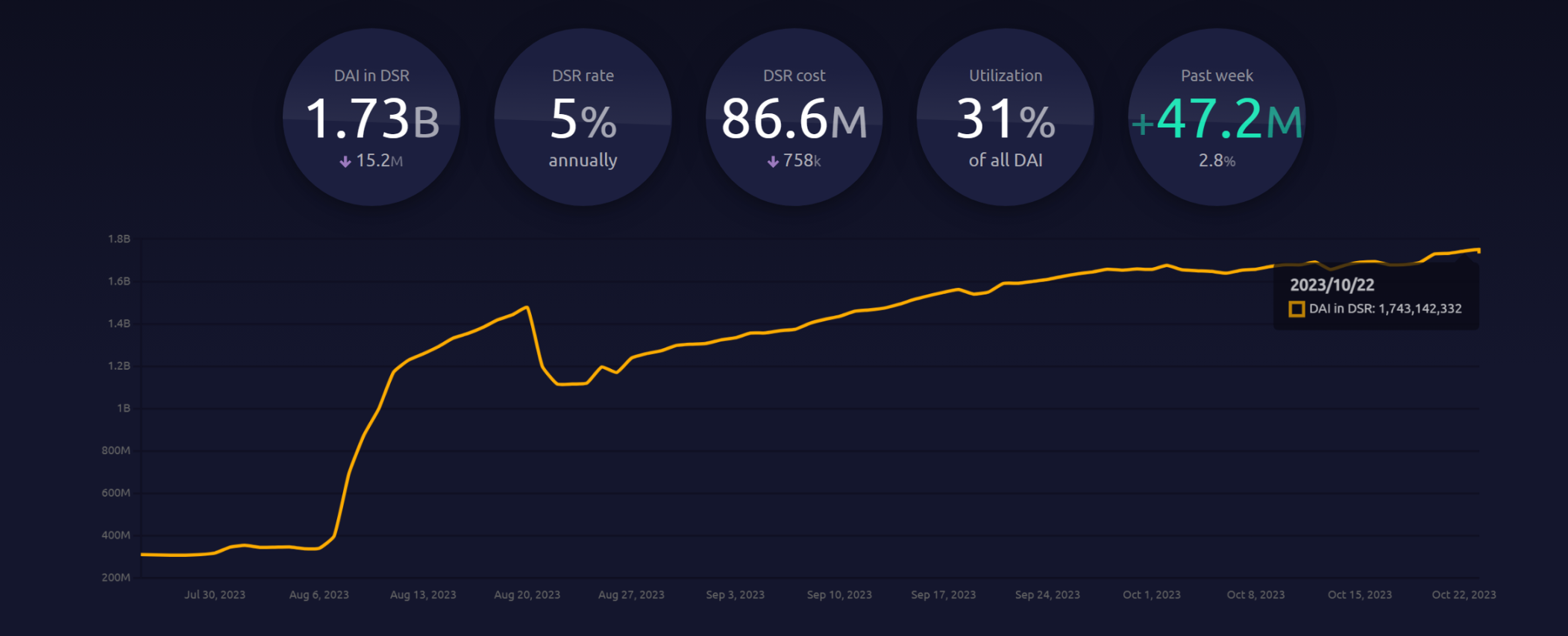 而目前增强型 DAI 储蓄利率(EDSR)为 5% ,共计有 17.3 亿枚 DAI 在 DSR,使得 DSR 合约的整体利用率(存在 DSR 合约内的 DAI 数量 / DAI 总供应量)已远远超过 20% 的阈值,高达 31% 。