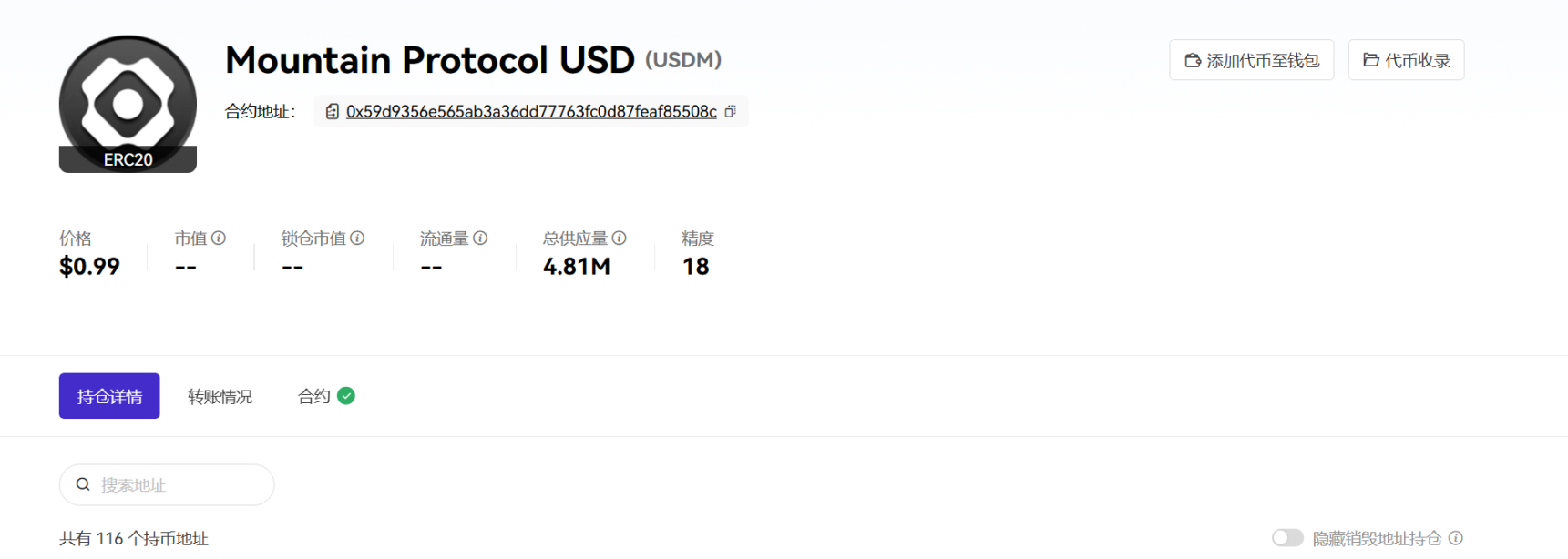 OKLink 数据显示,目前 USDM 的总发行流通量约 481 万枚,总持有地址数 116 个。