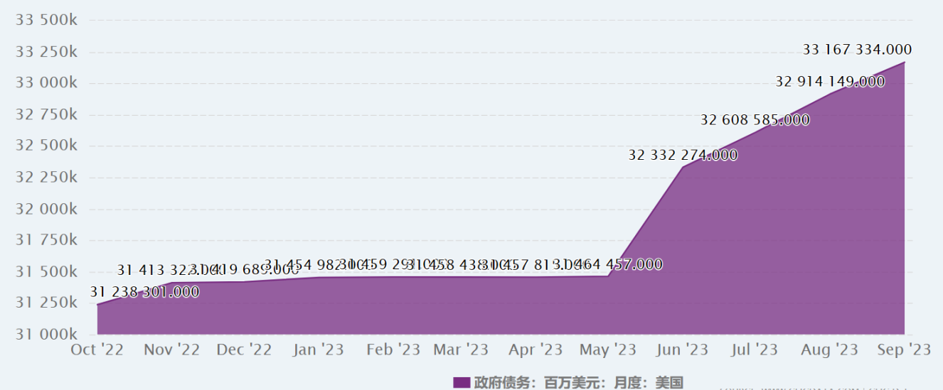 从数据维度看,截至 5 月底,美国政府债务规模为 31.4 万亿美元,而 6 月债务上限被打开后,到现在债务总规模已经突破 33 万亿美元,导致国债供求关系扰动市场流动性。
