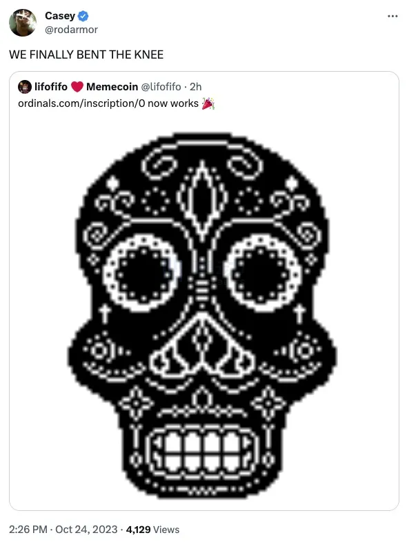 有趣的是,在一则「庆祝可以再次通过 URL 的铭文编号直达所对应的 NFT」的推文中,Casey 的转发评论里似乎还带着点无奈与耿耿于怀,「我们最终屈膝了」。