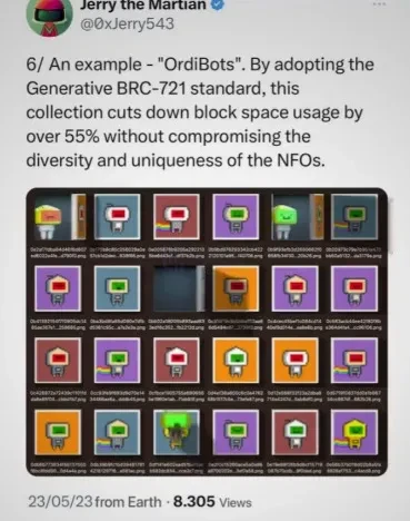 @RAF_BTC 在宣布 Ordibots 3D 的推文中制作了一条视频,视频内容是今年 5 月份以 Generative BRC-721 发行的首个 NFT 系列 OrdiBots 发售推文,一个个 3D OrdiBots 推开静止的 NFT 图片大门陆续降落。