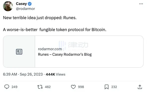 Ordinals 创始人 Casey Rodarmor 一直对 BRC 20 持反对意见,因此在 9 月 26 日,提出了基于比特币网络的新协议 Runes,将作为对 BRC 20 的潜在替代方案。Casey Rodarmor 表示 Runes 这样的可替代代币协议不会像 BRC 20 代币会在比特币网络上留下大量「垃圾 UTXO」。