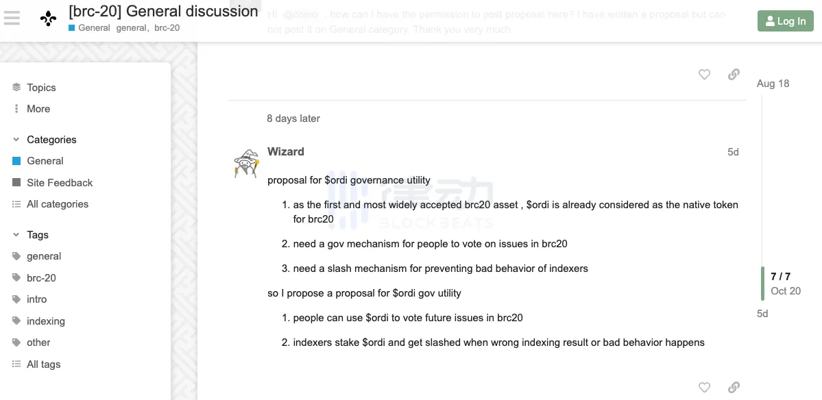 KOL 0x Wizard(@0x cryptowizard)提出了一个治理提议,他认为作为第一个以及最广为接受的 BRC 20 资产,$ordi 已经被认为 BRC 20 协议的 Native Token,由于越来越多关于 BRC 20 的提案出现,出于去中心化治理的需要,人们需要一种治理机制和惩罚机制,来避免中心化 indexer 作恶。因此,0x Wizard 提出关于 $ordi 作为治理 token 的提议,社区参与者可以使用 $ordi 对 BRC 20 的未来提案进行投票。indexer 需要质押 $ordi 进行 indexing,同时获取相应的生态费用(如未来的各种生态手续费),如果出现错误/恶意的结果,将罚没 indexer 质押的 $ordi。