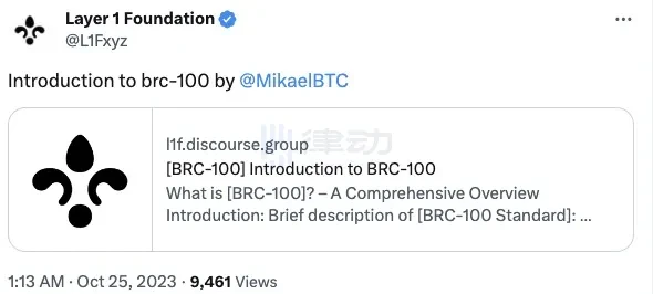在开发者的构想中,BRC-100 有着十分丰富的用例, 10 月 25 日,BRC-20 的创始人 domo 所成立的基金会 Layer 1 Foundation 发布了 BRC-100 的介绍,有 domo 背书,BRC-100 成了社区今日关注的热点。