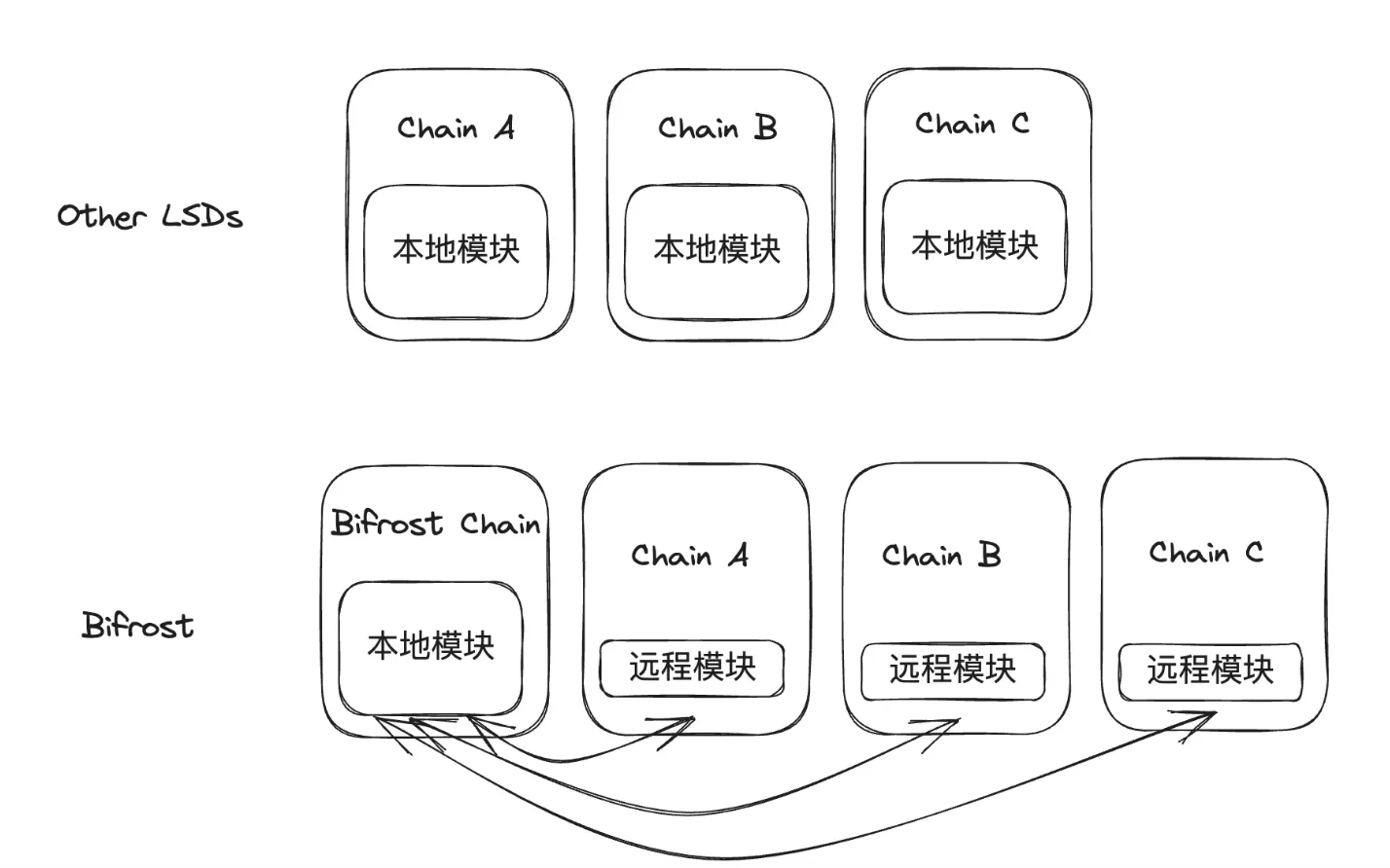 For example, Bifrost 自称是 全链 LSD 的开拓者,采用不同于其他 LSD 产品的架构设计。Bifrost 有一条自己的链 Bifrost Parachain,该链是 Polkadot 的平行链。Bifrost 的流动性质押模块仅部署在 Bifrost Parachain 上,其 LSD 资产—— vToken 的流动性也全在 Bifrost Parachain 上,但其他链可以通过远程调用的方式使用 Bifrost Parachain 上的流动性质押模块和流动性。如此一来: