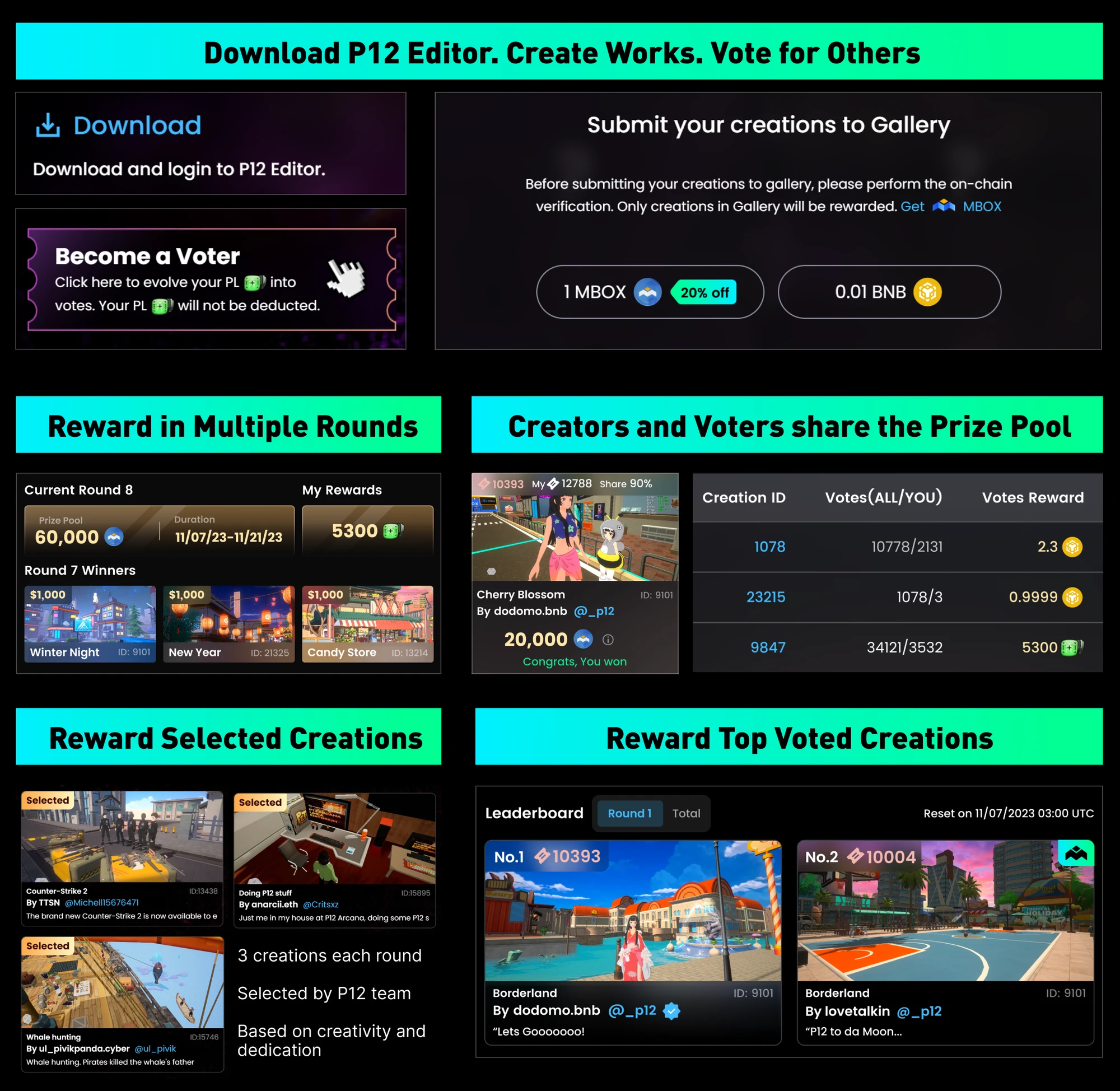在每个回合中,将奖励得票数最高的创作作品。同时, P12 和 Mobox 评委将基于创意和奉献精神选择另一批优秀作品。