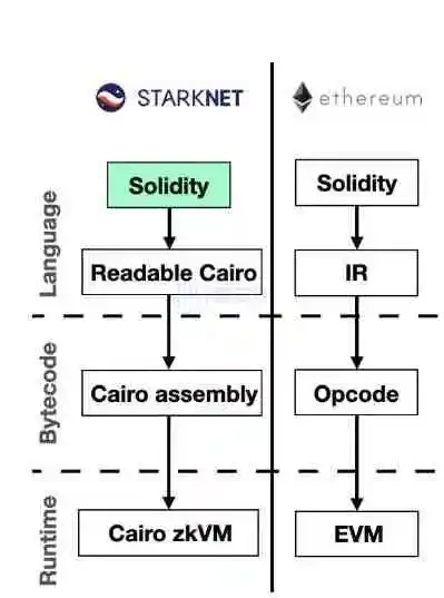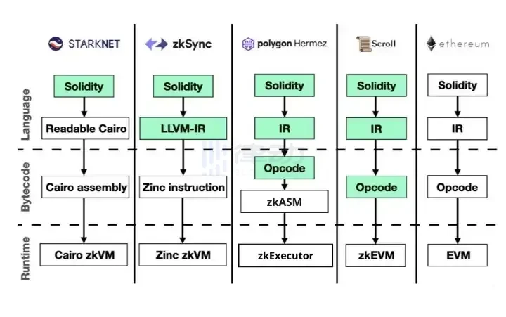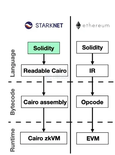 Starknet 和 zkSync(语言层面):这些目前是专用解决方案,使用自定义虚拟机(Cairo VM)运行。它们运行一个自定义 VM,并创建了一个编译器「Warp Transpiler」,将 Solidity 代码转换为 Cairo VM 字节码。