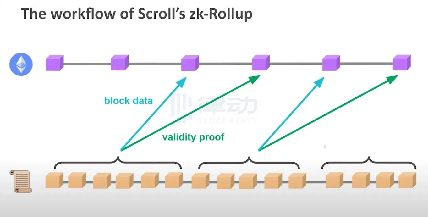 Scroll 能够批量处理区块,并将区块数据写入以太坊。一旦在后续区块生成有效性证明,它将被写入以太坊。