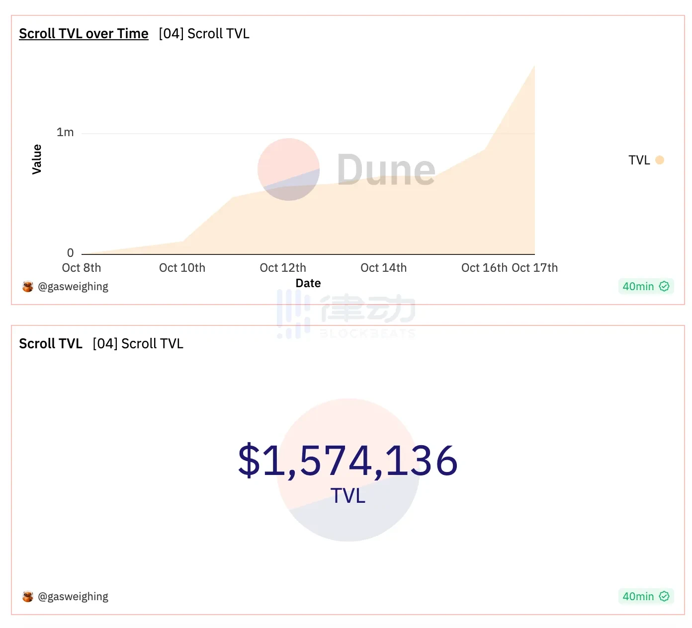 自发布以来,Scroll 的总锁定价值(TVL)已累计超过 150 万美元,呈现稳定增长态势。