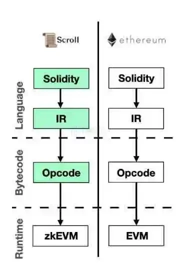 Scroll(字节码层面):将 EVM 执行直接转换为可验证的电路,从而在工具支持和兼容性方面带来好处。