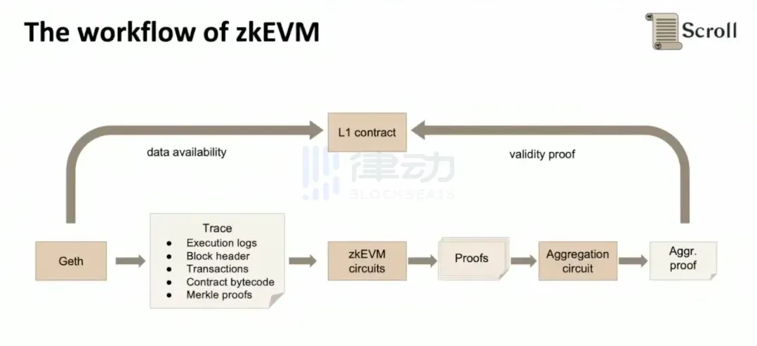 Scroll 是一个 zk rollup,它在 Eth L1 上有一个智能合约,这是一个 zkEVM 证明验证器,能够验证 Scroll 协议是否安全。