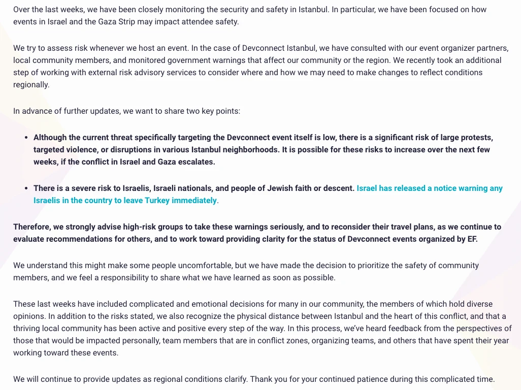 虽然没有明确提及是否会更改「Devconnect Istanbul」的日程安排,但从字里行间可以看出,不排除以太坊基金会可能因为风险加剧而调整原定计划。