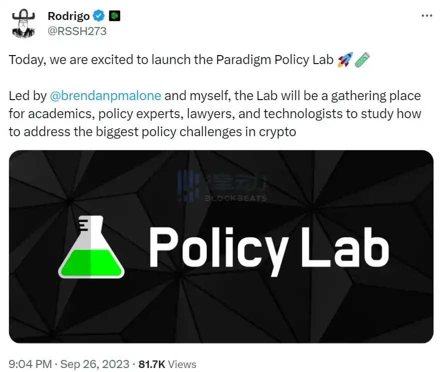 政策实验室联合负责人 Rodrigo Seira 在采访和博文中表示:「在过去的一年里,Paradigm 已经确立了自己作为政策领导者的地位,从在法庭上为加密货币而战,到召集意见领袖,再到发布以政策为中心的研究,无所不包。」