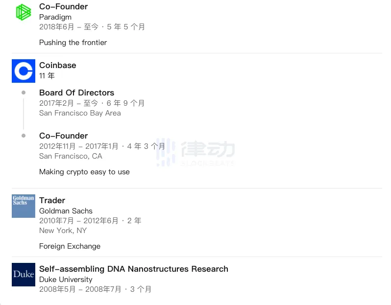 Paradigm 联创兼前管理合伙人 Ehrsam 出生于波士顿,可以说是一个传奇人物。他在高中时专业玩电子游戏,并且是一个狂热的魔兽世界玩家,在游戏里接触到了 Crypto 的概念。2010 年,Ehrsam 以优异的成绩毕业于杜克大学,获得计算机科学学士学位,辅修经济学。从杜克大学毕业后,Ehrsam 成为纽约投资银行高盛( Goldman Sachs )的外汇交易员。还曾在纽约贝莱德担任投资组合分析师。