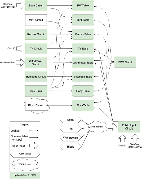 zkEVM 由许多电路组成,每个电路负责检查EVM的某个方面。这些电路最后以某种方式进行聚合或组合,共同完成交易执行的证明。下图显示了这些电路和表格之间的关系: