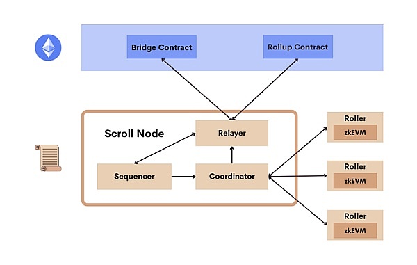 Scroll Node: 它根据用户交易产生 Scroll 网络的区块,将这些交易提交到以太坊基础层,并处理以太坊和 Scroll 之间的消息传递。