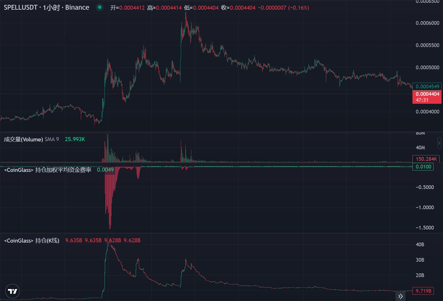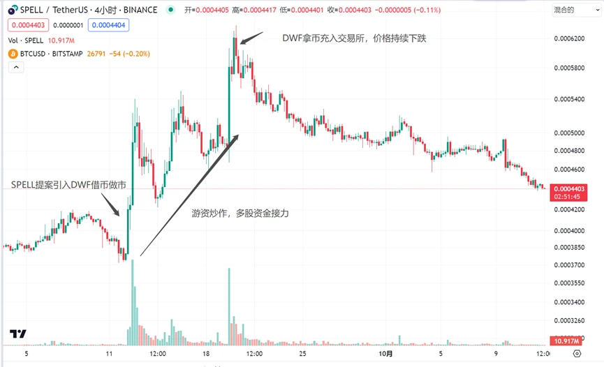 9 月 19 日 Abracadabra 向 DWF 提供了 3.3 M 的 SPELL 贷款,随后 DWF 将其转入币安,SPELL 进入下跌通道,现报价 0.0004416 ,相较于前期高点已经下跌 31% 。