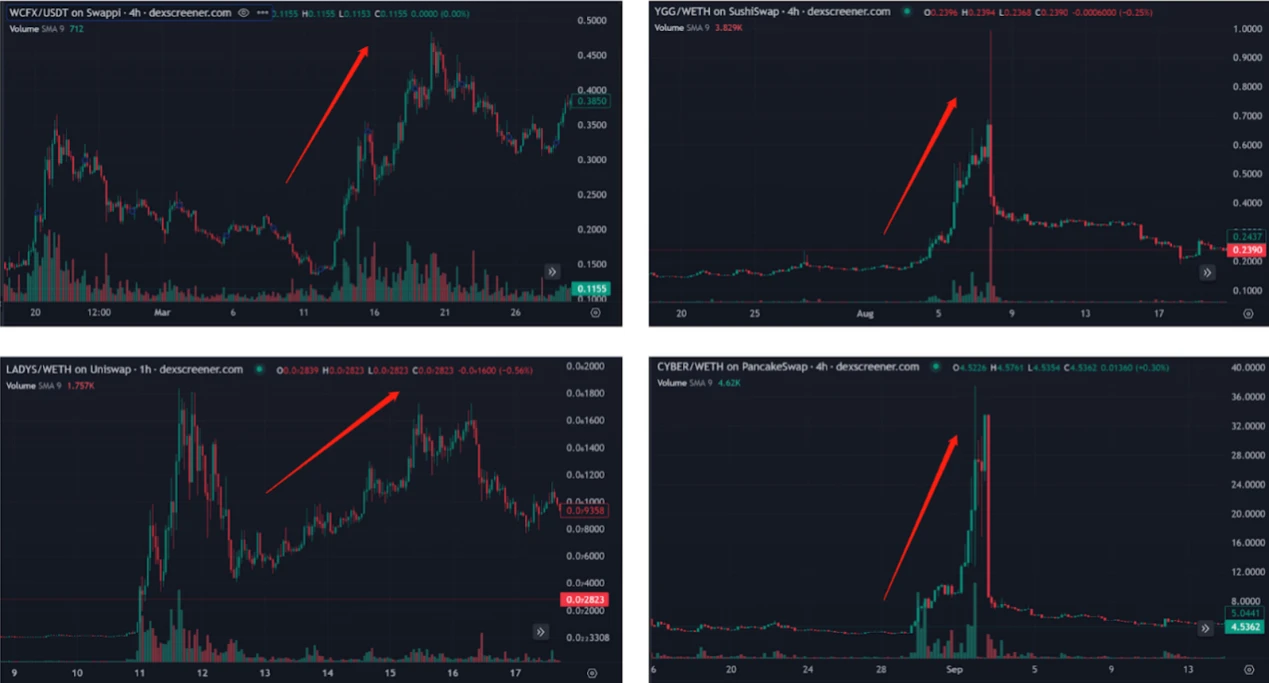 2、DWF 向项目方 OTC 买币(包装为战略投资)的标的在二级市场价格上往往首先表现出数月的下跌,而后急速的拉盘,在 DWF 向交易所充币之后行情结束(拉盘行情通常不超过 1 周);