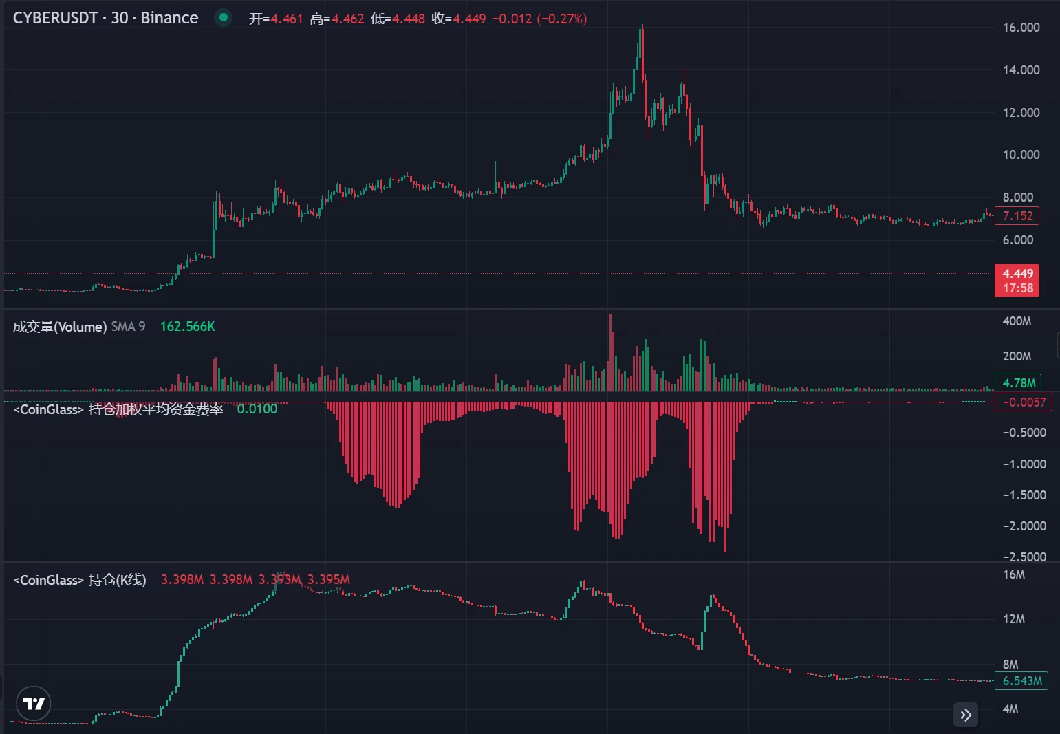 在资金数据层面,CYBER 的表现与 YGG 类似:合约数据在早期表现出持仓量的暴涨,费率的稳定;在中期表现出持仓增长的放缓,费率的下降,在后期表现出多头平仓带来的持仓下降。