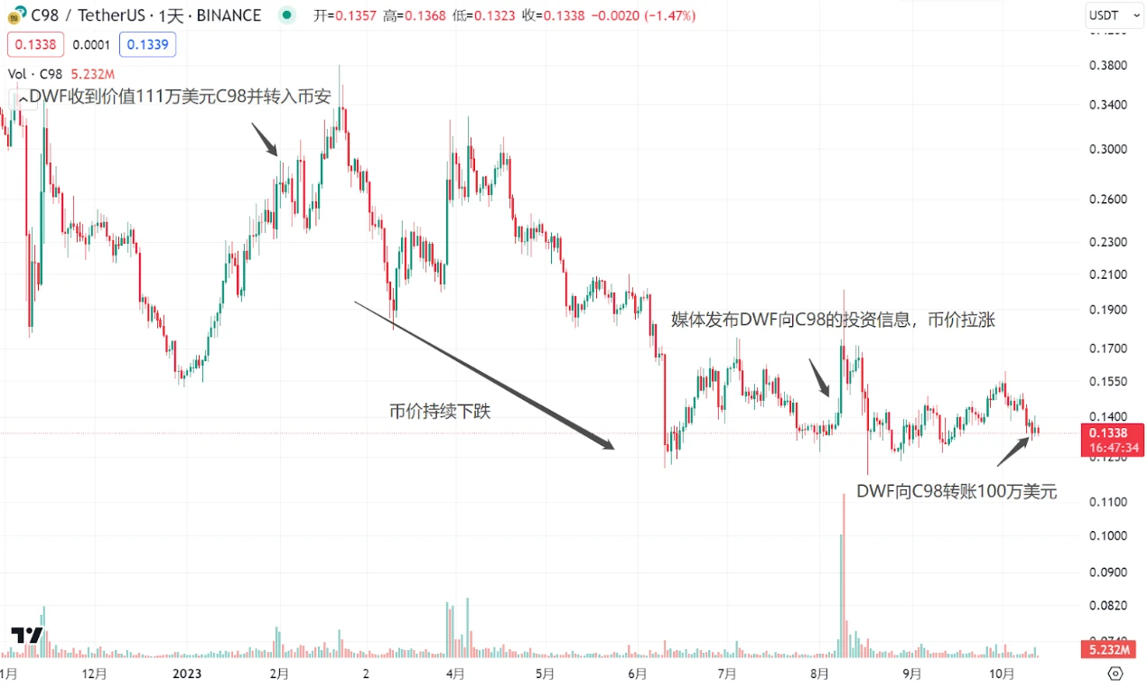 2023 年 2 月 2 日,DWF 链上地址收到从 Coin 98 官方地址的转账,共计 412 万枚左右,按当日市价折算约 111 万美元(当日 C98 二级市场价格约为 0.27 美元),随后立即转入币安交易所;8 月 8 日,Coin 98 宣布获得 DWF Labs 的七位数投资,以推动Web3的大规模采用;10 月 12 日,据媒体报道,DWF 向 C 98 转账 100 万 USDT。结合 C98 价格表现,在 DWF 收到代币并转入交易所后, C98 短暂上涨后进入了长达 5 个月的下跌, 8 月 8 日媒体发文价格两天时间较前低拉涨 58% ,随后快速下跌。回顾该事件,其本质或为 DWF 向 C98 项目方 9 折拿币,而后二级市场抛售获利。