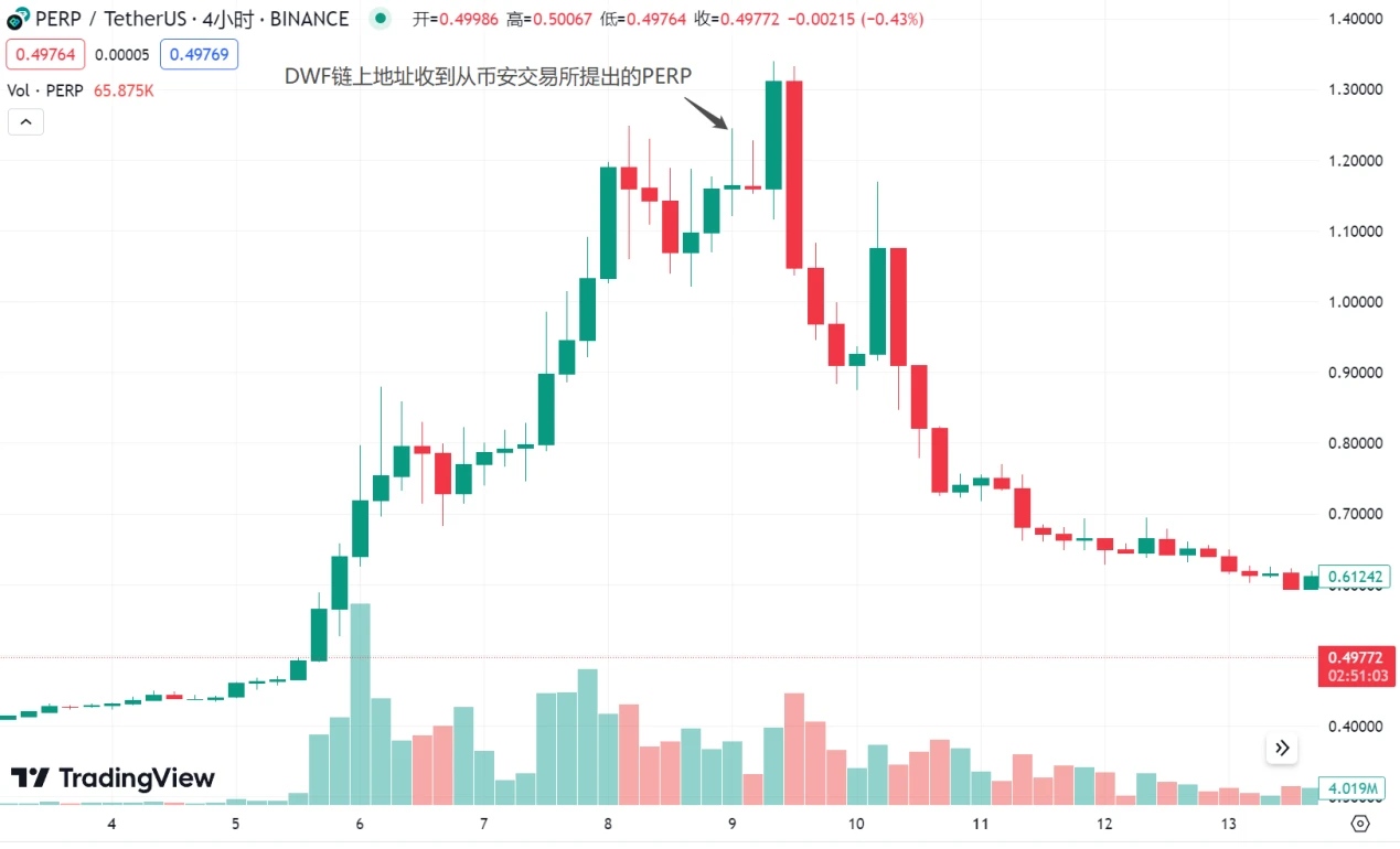 另, 9 月 8 日,DWF 链上地址收到来自币安的 PERP 转账,此前 PERP 已经上涨数倍,在 DWF 出现交易所提币情况后,PERP 买盘明显增多,币价短暂拉高后伴随大额砸盘进入下跌通道,行情结束。