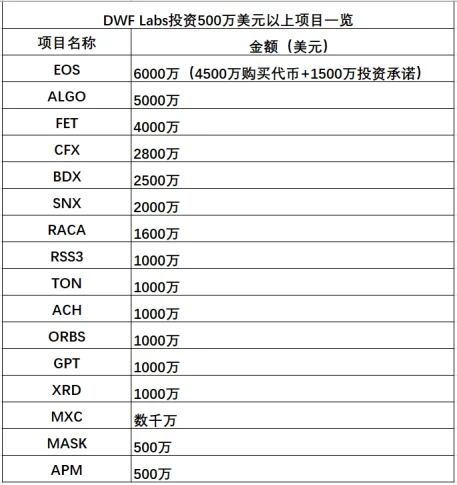 DWF 作为一家新进的投资机构在熊市中频繁出手,DWF 合作项目超过 260 个;据媒体报道 DWF 投资项目超过 100 个,其中不乏大额投资,总结其投资超过 500 万美元的项目有: