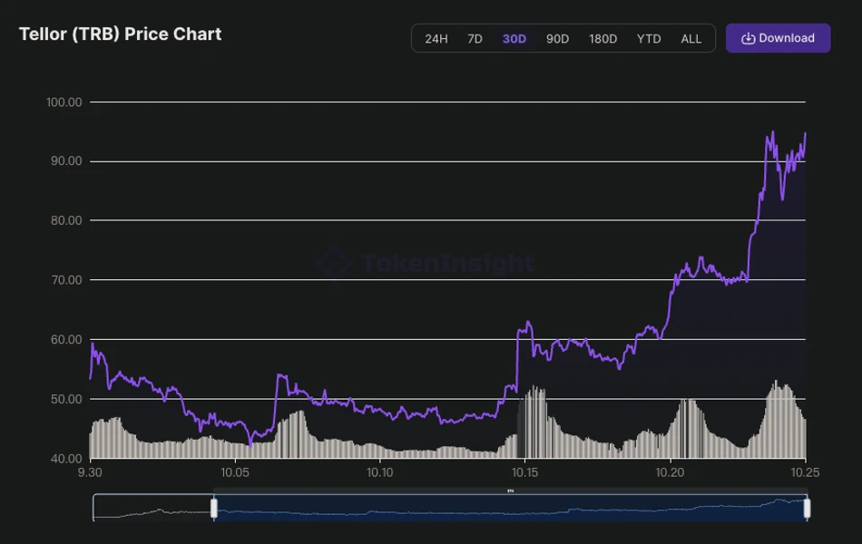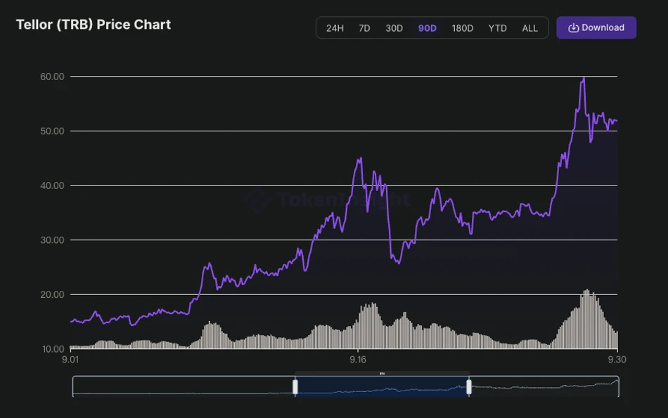 TRB 最初的暴涨开始于 2023 年 9 月。根据 TokenInsight 的数据,TRB 的价格自 9 月 7 日开始明显上涨,在一周内从十几美元一路飙升至最高 45 美元,并最终于 9 月底超过 60 美元,单月涨幅高达 275% 。