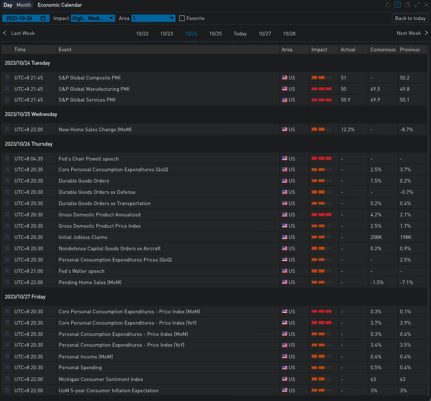 昨日(25 Oct)美债收益率有所反弹,十年期美债收益率一路上行重回 4.9% 上方,现报 4.969%;两年期美债收益率先跌后涨,现报 5.129%。美股三大股指均收跌,其中道指和 S&P 分别下跌 0.32% /1.43%,纳斯达克收跌 2.43%,创下今年 2 月以来的最大单日跌幅。今晚(26 Oct) 8: 30 pm 市场将着重关注美国发布的包括 GPD 在内的一系列重磅数据。