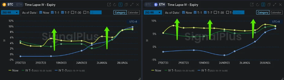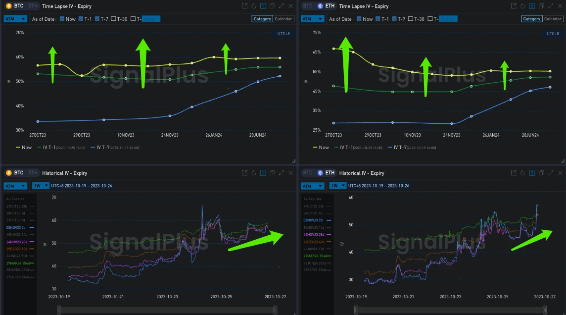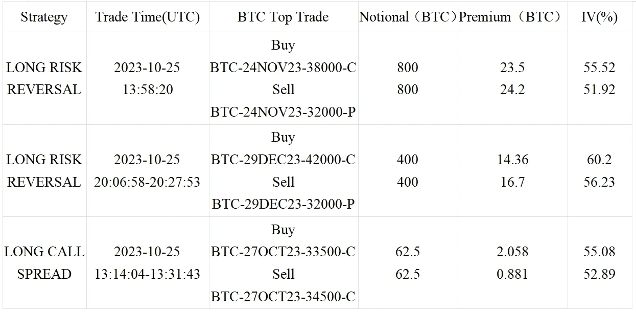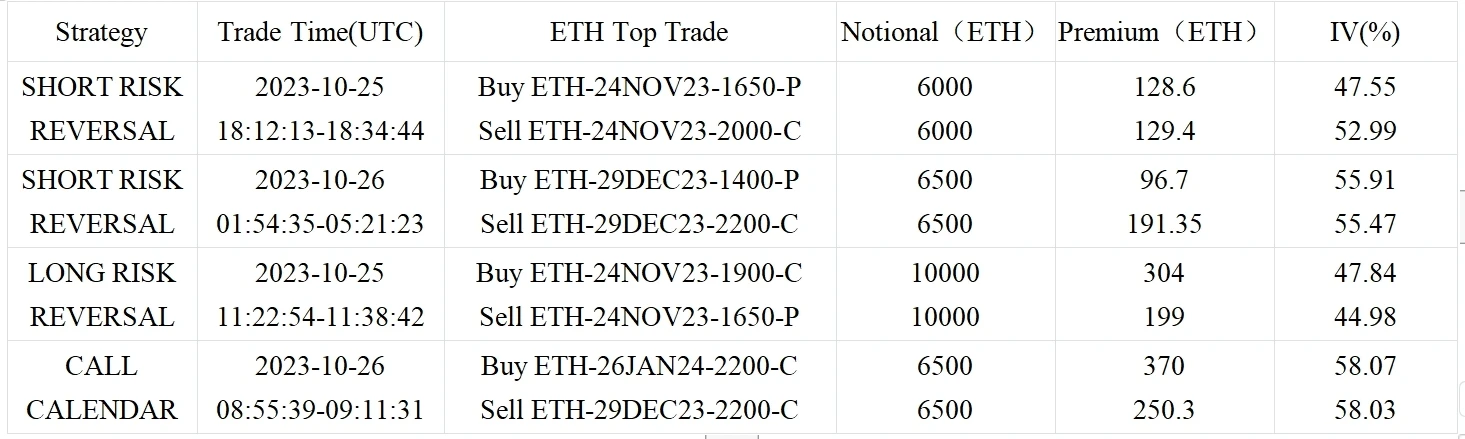 除此之外,中远期上(24 Nov 23 ~ 26 Jan 24)卖近买远的看涨期权日历价差策略也是昨日交易热点。其中 BTC 以三角价差为主(卖出 24 Nov/29 Dec 的 Call,买入更远期限的 Call 做保护),ETH 则多是以 Sell 29 Dec 2200 C vs Buy 26 JAN 24 2200 C 为代表的 Call Canlendar 策略。