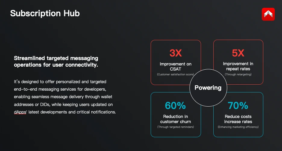 未来,Dmail 将持续迭代 Subscription Hub 服务,构建 AI 驱动的去中心化通信基础设施,提供跨多链和多 dApps 的加密电子邮件、聚合通知以及精准营销等服务,满足Web3用户、开发人员和营销人员的多样化需求,让用户在数字环境中了解情况并保持联系,从而轻松、无缝地访问重要数据和消息。