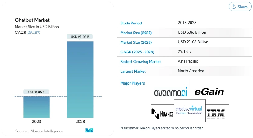 如 Andreessen 所述,资本市场对于对话型 AI 赛道的未来发展前景相当看好。Mordor Intelligence 所发布的一份研报指出, 2023 年对话型 AI 赛道的市场规模估值约为 58.6 亿美元, 2028 年预计则可达到 210.8 亿美元,年复合增长率高达 29.18% 。