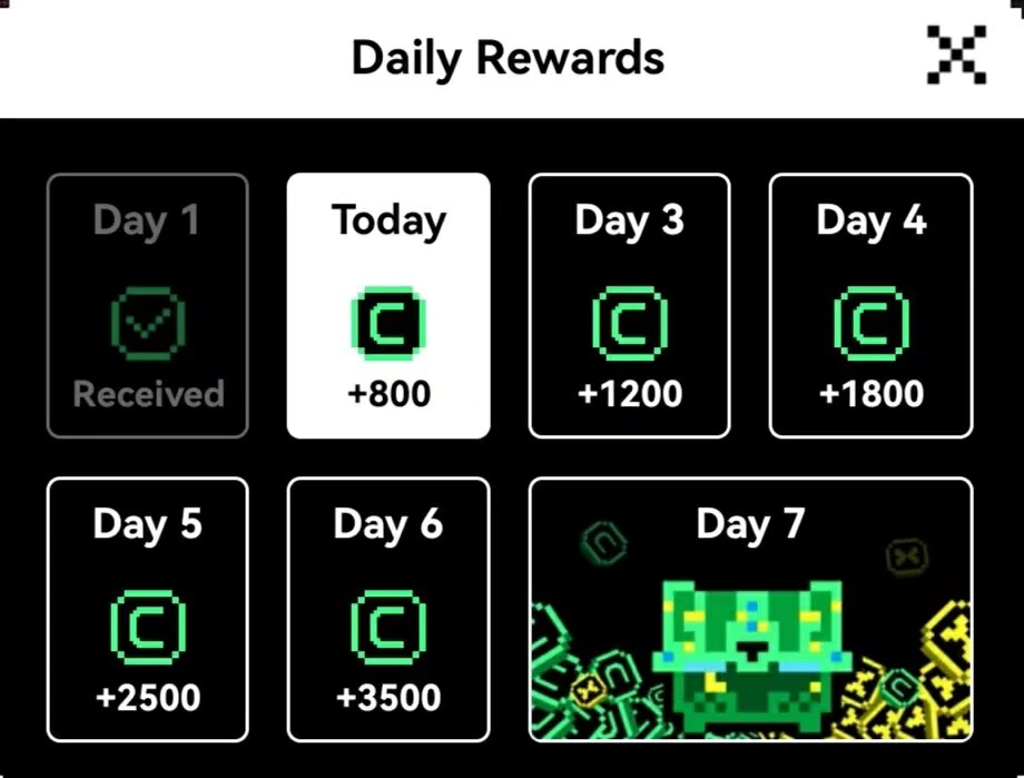 登录完毕后,首先会跳出一个签到界面,我们可以通过日常签到来获取与 AI 角色交互所需的 CXC,具体每日签到可获得的代币数额如下图所示。