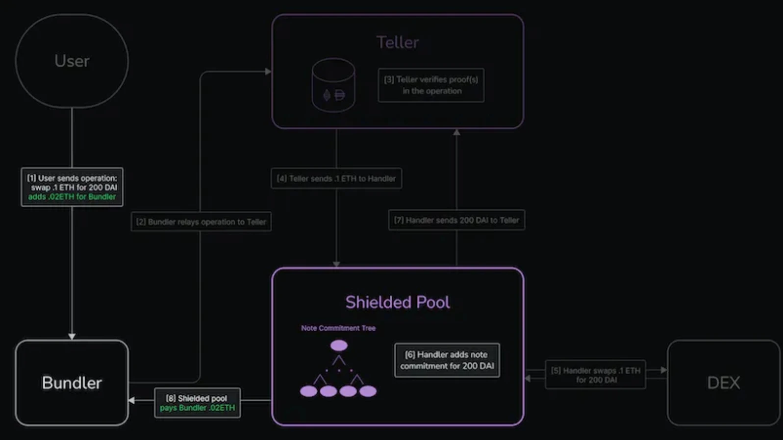 隐蔽池是一种协议,允许核算和支出资金而不暴露其所有者。用户将资金存入隐蔽池,作为回报产生一个代表用户对其资金的权利的“note”。一个 note 上的主要字段是代币地址、note 包含的代币数量以及所有者的“标识符”(地址)。要花费 note 中包含的资金,用户必须以零知识证明拥有与 note 中的所有者字段对应的密钥。