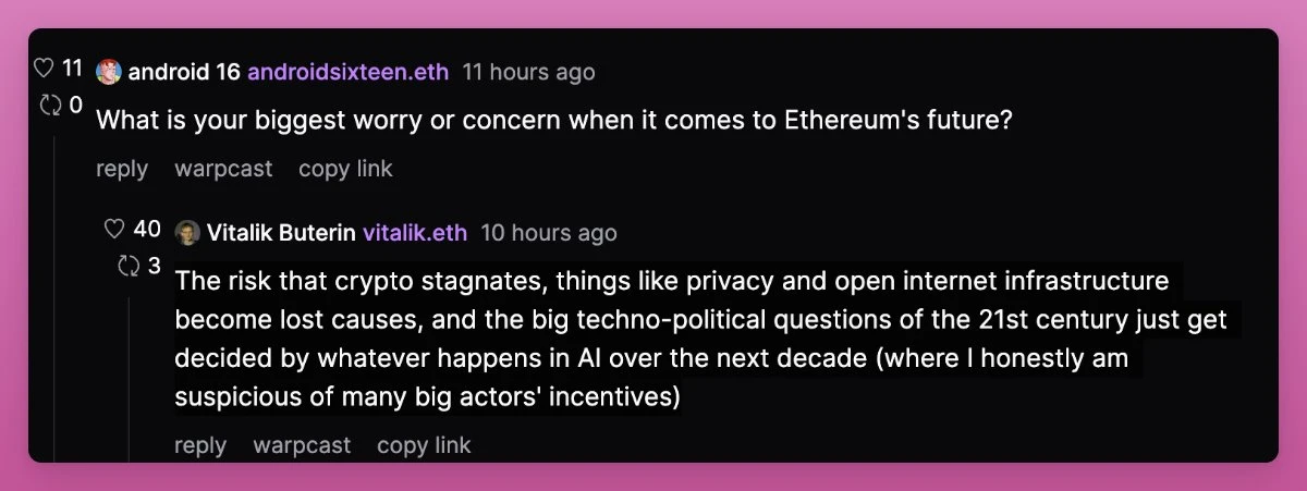Vitalik 长久以来持续关注着隐私赛道,在 Farcaster 10 月举行的一次 AMA 活动中,面对“对以太坊的未来最担心什么”的问题,Vitalik 表示:“ 加密行业停滞、隐私和开放的互联网基础设施都可能成为(以太坊)失败原因。 ”