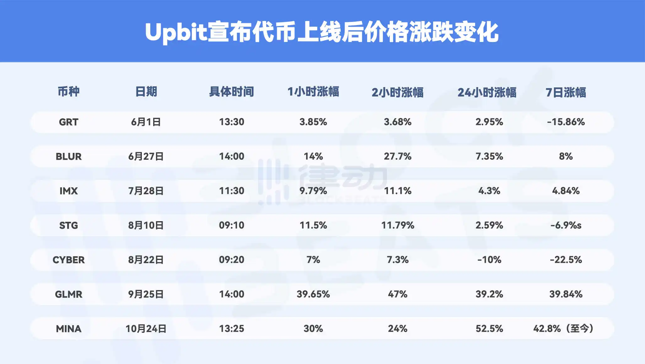 6 月 1 日,GRT 受到 Upbit 上线的消息影响,短时上涨突破了 0.15 美元, 15 分钟内最大涨幅达到了接近 15% 。同月的 27 日,BLUR 被 Upbit 上线,并在当天涨到了 0.4 美元, 24 小时涨幅达到了 13.35% 。随后在 7 月 28 日,IMX 上线 Upbit 后,短时涨幅突破了 0.8 美元, 24 小时涨幅为 9.7% 。