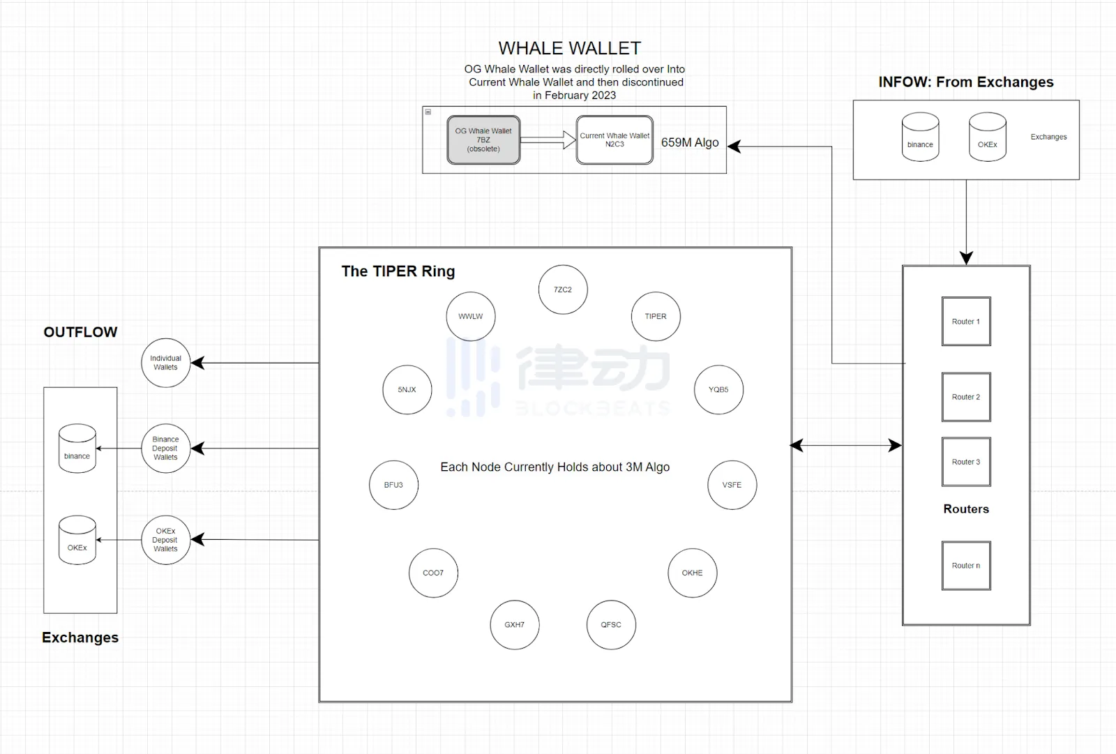 接着 Upbit 在 2020 年 9 月 9 日发布了一份通知,宣布刚刚上市 Algorand。「TIPER ring」也是 11 个账户的集合,它们是向 Whale 钱包提供和外部交换/钱包流出的网络的核心。