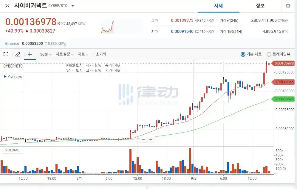9 月 1 日,Upbit 上 CYBER 标价同期较 Binance 平台报价溢价超 45% 。9 月 2 日,事件来到了最高潮,CYBER 持续溢价,从 30% 飙升至 167% 。