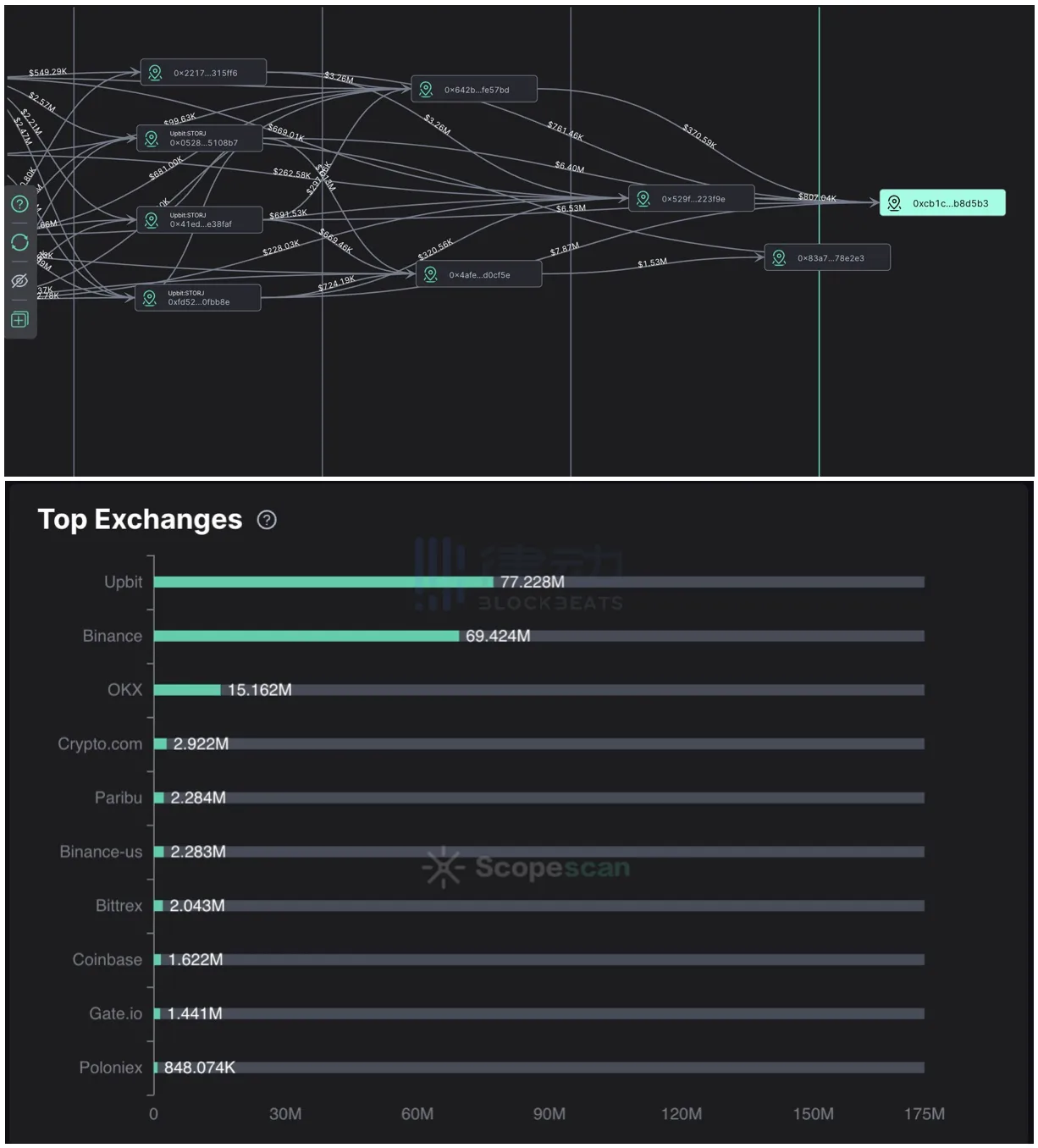 上图为$STORJ 转入 Upbit 站内的链上路径;下图为各交易平台$STORJ 持币量,图源:Scopescan