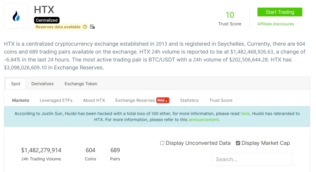 Coingecko 数据显示,目前火币 HTX 的 24 小时成交量达 1, 482, 279, 914 美元。作为一家老牌交易平台,火币 HTX 的综合实力依然强大,Top 级交易所的数据也在一定程度上代表着当下市场对走向的判断。