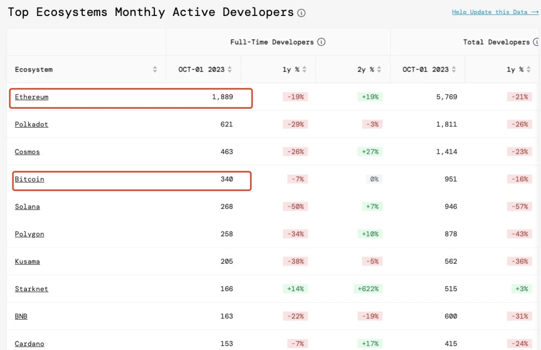 1.活跃开发者数量问题。 据 Developerreport 数据,作为市值排名第一的加密货币,当前 BTC 生态开发者数量为 340 人,仅排在全行业的第四名,低于第三名 Cosmos 的 463 人,远低于排名第一的以太坊——活跃开发者数量为 1889 ,大约是 BTC 生态的 5.6 倍。