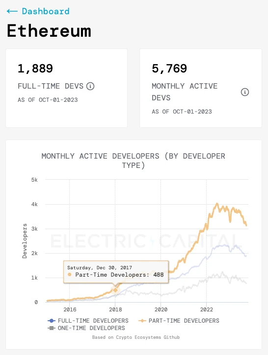 这还只是基于全职开发者的计算,如果加上兼职开发者,这一差距将会更大。BTC 生态目前兼职开发者为 478 ,全职与兼职开发者总数达到 818 ;与之相对的,ETH 生态兼职与全职的开发者总数在 5012 ,二者相差 6 倍。