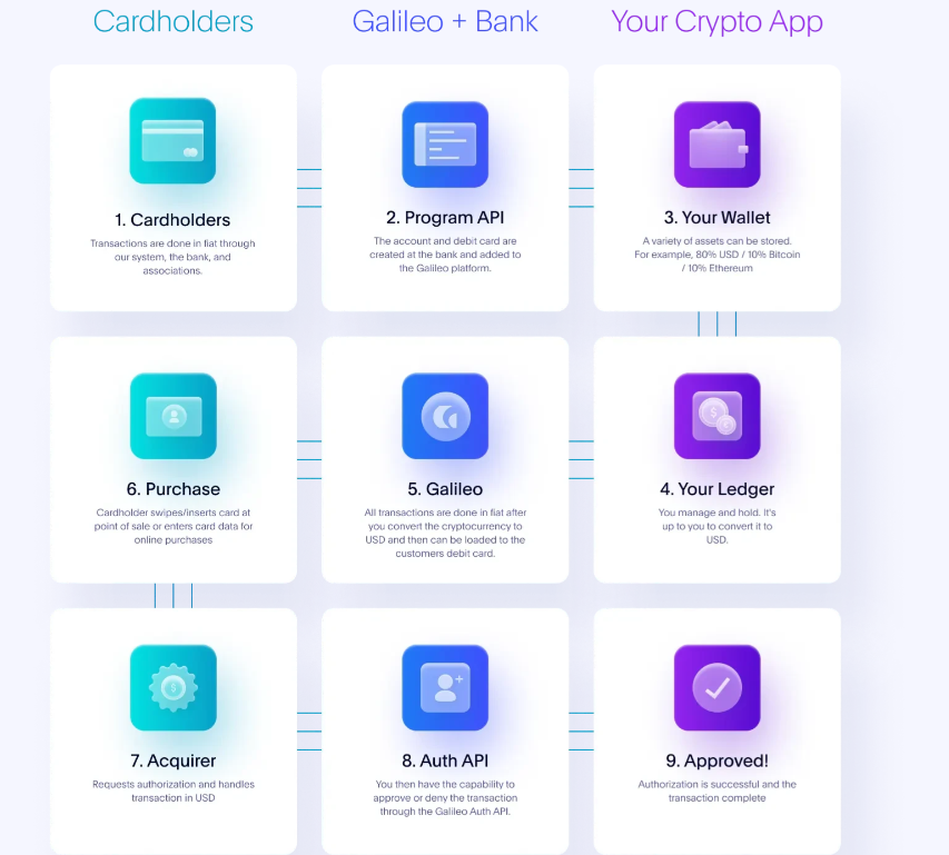 从上图中可以看到,有发卡需求的加密应用可能只是需要提供钱包地址和管理账目(紫色),消费者的开卡、交易、授权、清算等行为全由 Galileo 完成(蓝色)。